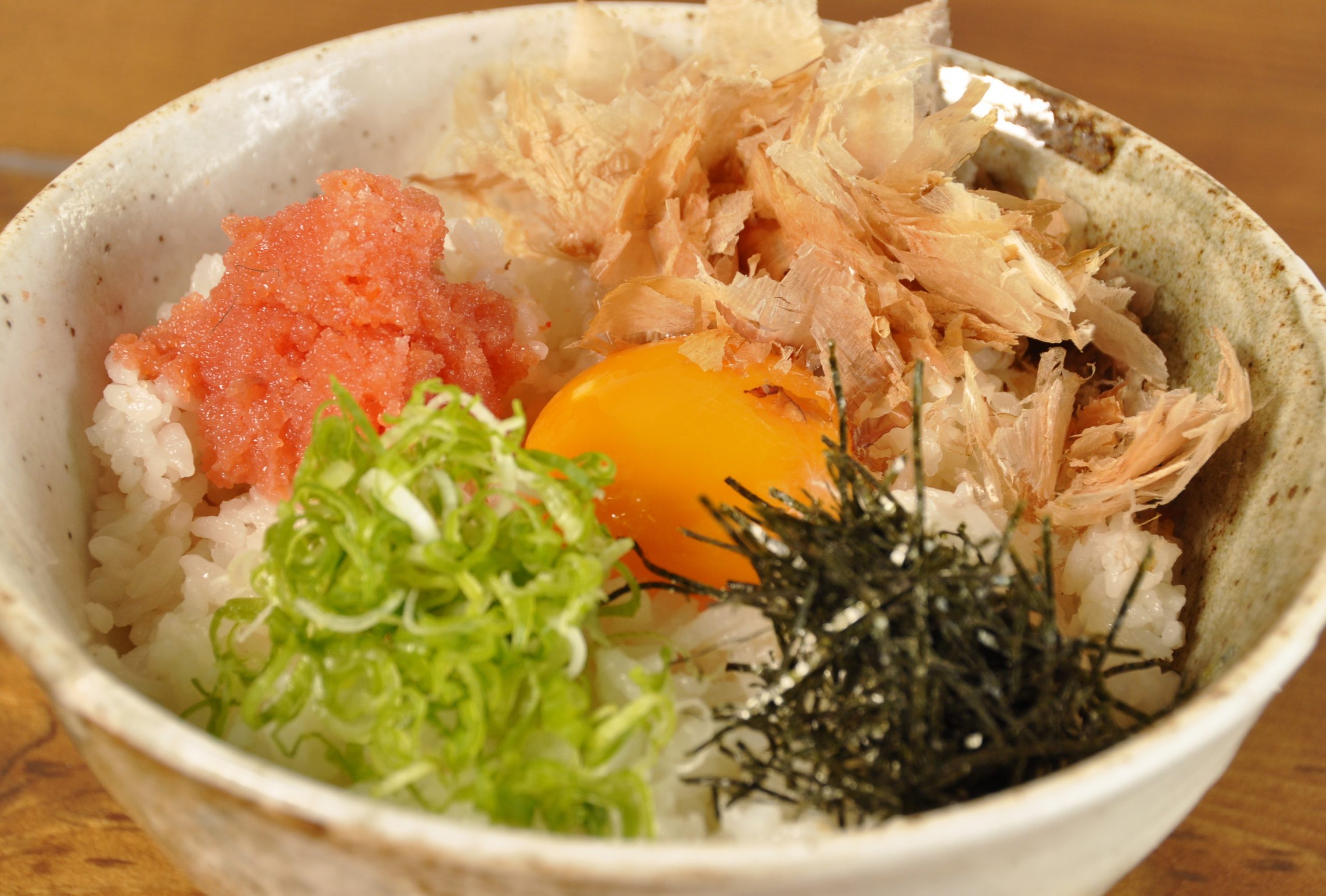 Egg, mentaiko, bonito flackes, seaweed